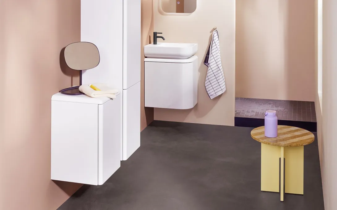 Ergänzen lässt sich die Waschtischeinheit mit den kompakten Schränken der b:me Kollektion und einem Gästebad-Leuchtspiegel in abgerundetem Design, mit umlaufendem LED-Lichtband mit Sensorschalter.