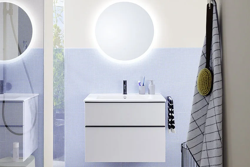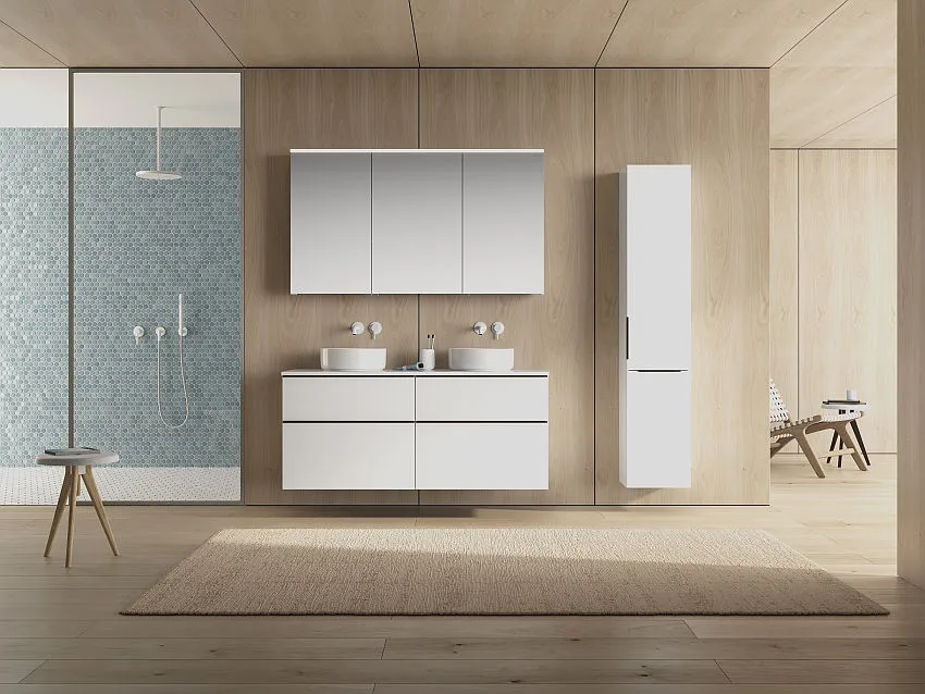Neu ist der RL20-Spiegelschrank (sieben Varianten, 60 bis 160 cm Breite) mit umlaufender LED-Beleuchtung, stufenlos regelbarer Lichtfarbe, Dimmfunktion und integrierter E-Box mit USB-C, wahlweise als Aufputz- oder Wandeinbau-Variante, ausgezeichnet mit dem RAL-Gütezeichen Möbel Zirkulär Nachhaltig. Zusätzlich stehen runde Spiegel mit LED-Beleuchtung und optionaler Spiegelheizung zur Auswahl.