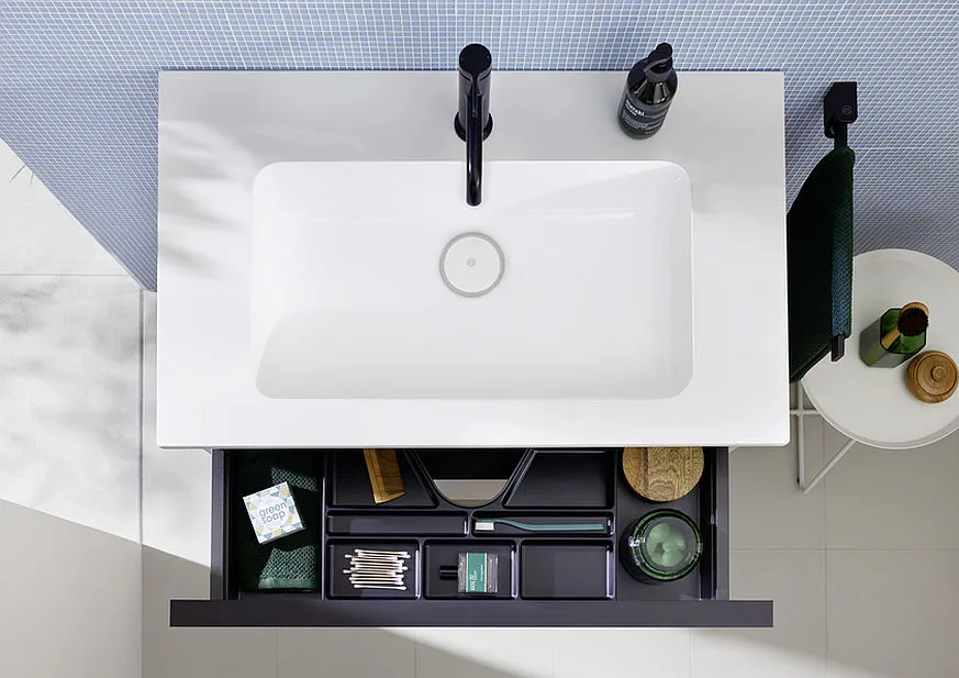 Ergänzend zu Möbeln und Waschtischen bietet Eqio passendes Zubehör. Dazu gehören Abdeckplatten, Regale, Stoffkörbe sowie die optionalen Ablaufabdeckungen für CleanFlow wie das cleanFlow+ Ventil, das die Stauraumfunktion um eine komfortable Push-to-open-Lösung erweitert. So wird Dein Waschplatz nicht nur praktisch, sondern auch hygienisch und komfortabel.