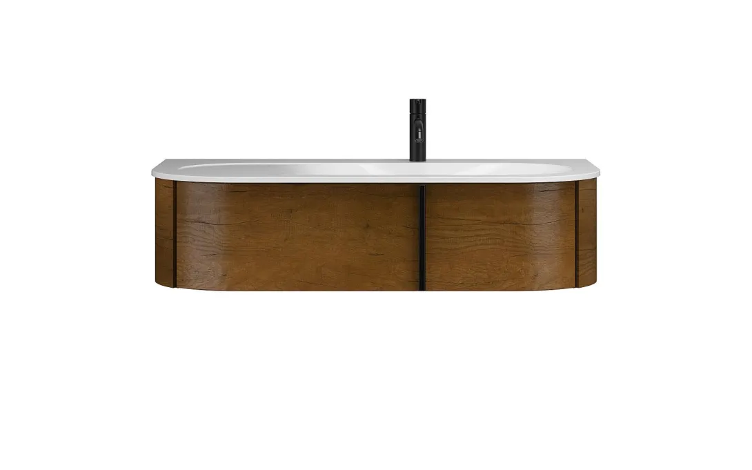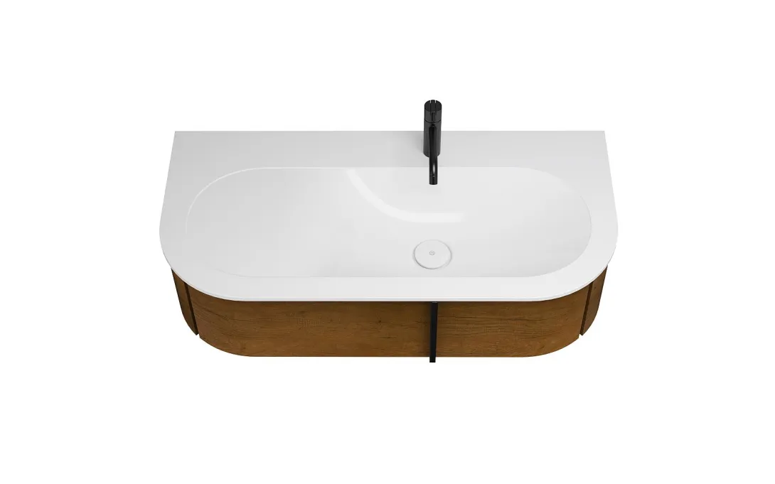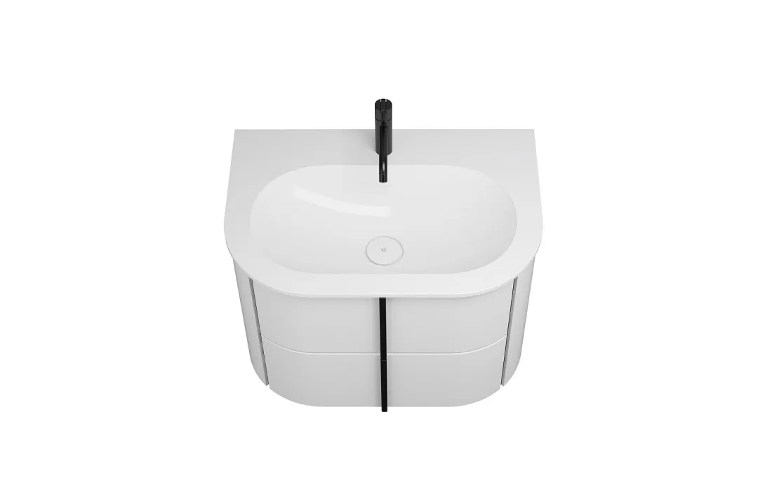 Ob Leuchtspiegel, Thermofronten oder Waschbecken – ovale Rundungen sind das stilprägende Design-Merkmal von Lavo 2.0. Auch die aus Mineralguss gefertigten Waschtische reihen sich in das Konzept ein. Die minimal überstehenden Tische wirken in Kombination mit der schlanken Kante sehr flächenbetont. Im Tisch eingebettet und von einem breiten Rand geschützt, befindet sich das ovalförmige Becken. Je nach Größe sind die Becken unterschiedlich positioniert. Während das Standard-Modell von 720 mm direkt in der Mitte platziert ist, sind größere Modelle rechts- oder linksbündig eingelassen, wodurch eine großzügige, sanft abfallende, seitliche Ablagefläche entsteht.