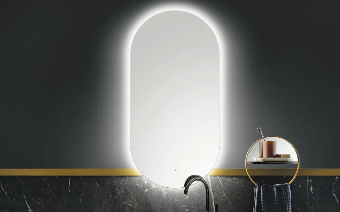 Kaum ein Element der Kollektion bringt das ovale Gestaltungskonzept so sehr auf dem Punkt wie der Leuchtspiegel mit umlaufender LED-Beleuchtung (Breite 500 mm, Höhe 1000 mm; 4250 K mit Sensorschalter).