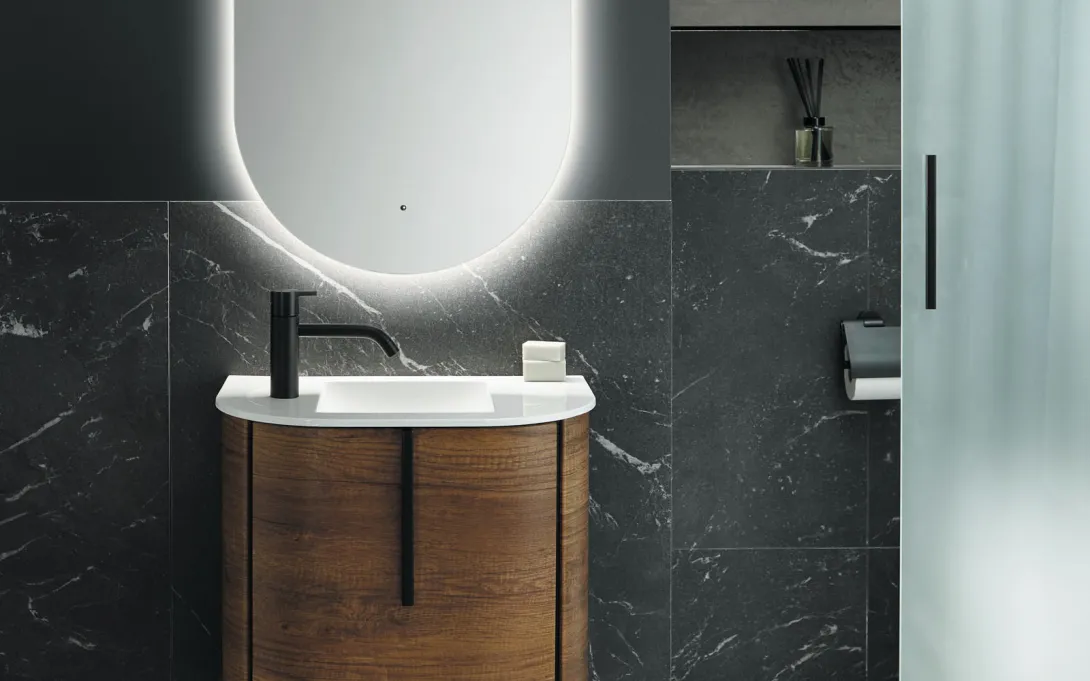 Lavo 2.0 ist ein Meister des Widerspruchs. Rundungen treffen auf Kanten, symmetrische auf asymmetrische Anordnungen, verborgener auf transparentem Stauraum und ovale Formen auf gerade Linien. Als Inspirationsquelle diente der Gegensatz von Sonne und Mond, gestalterisch umgesetzt durch das Aufeinandertreffen warmen Akzentlichts und kühler Farben – abgerundet durch messingfarbene Accessoires. Verschmelzende Übergänge sorgen dafür, dass Grenzen verschwimmen und sich scheinbare Widersprüche zu einem einheitlichen Gesamtbild zusammenfügen.
