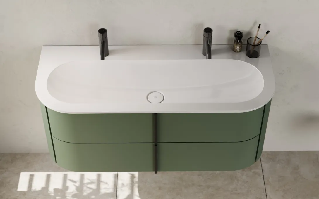 Ein modernes Badezimmer mit einem schwebenden, grünen Waschtisch, der mit einer weißen Oberfläche und zwei schlichten, schwarzen Armaturen ausgestattet ist.