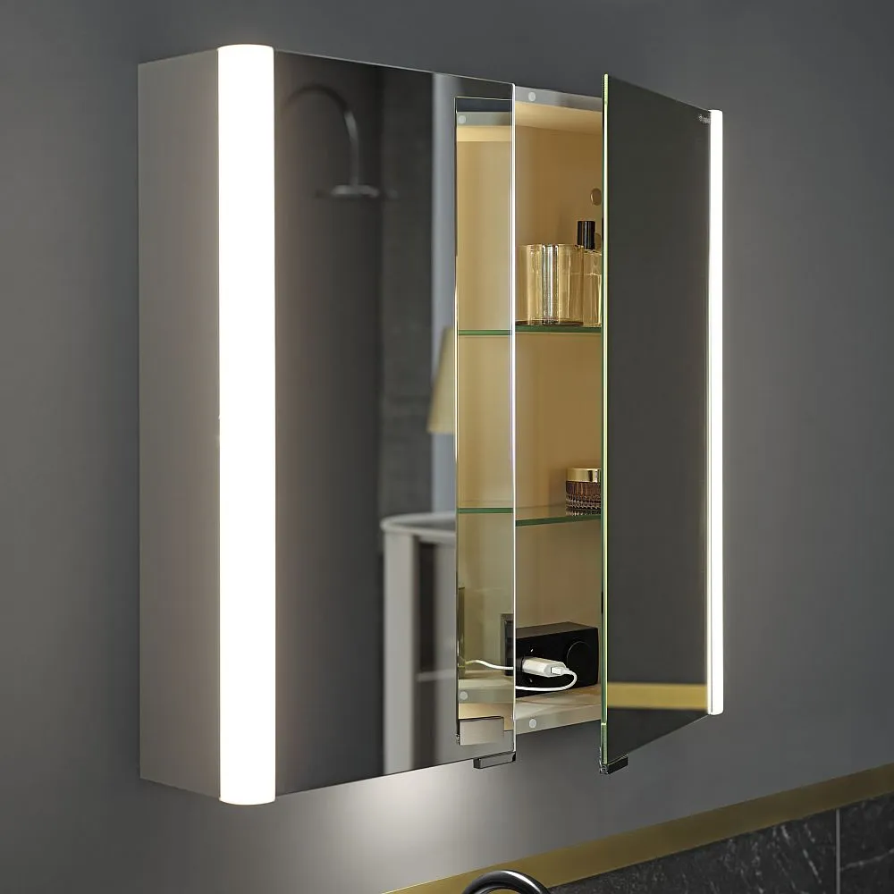 Ein eleganter Badezimmerschrank mit halb geöffneten Türen und integrierter Beleuchtung, der verschiedene Pflegeprodukte und Dekorationsartikel zeigt.