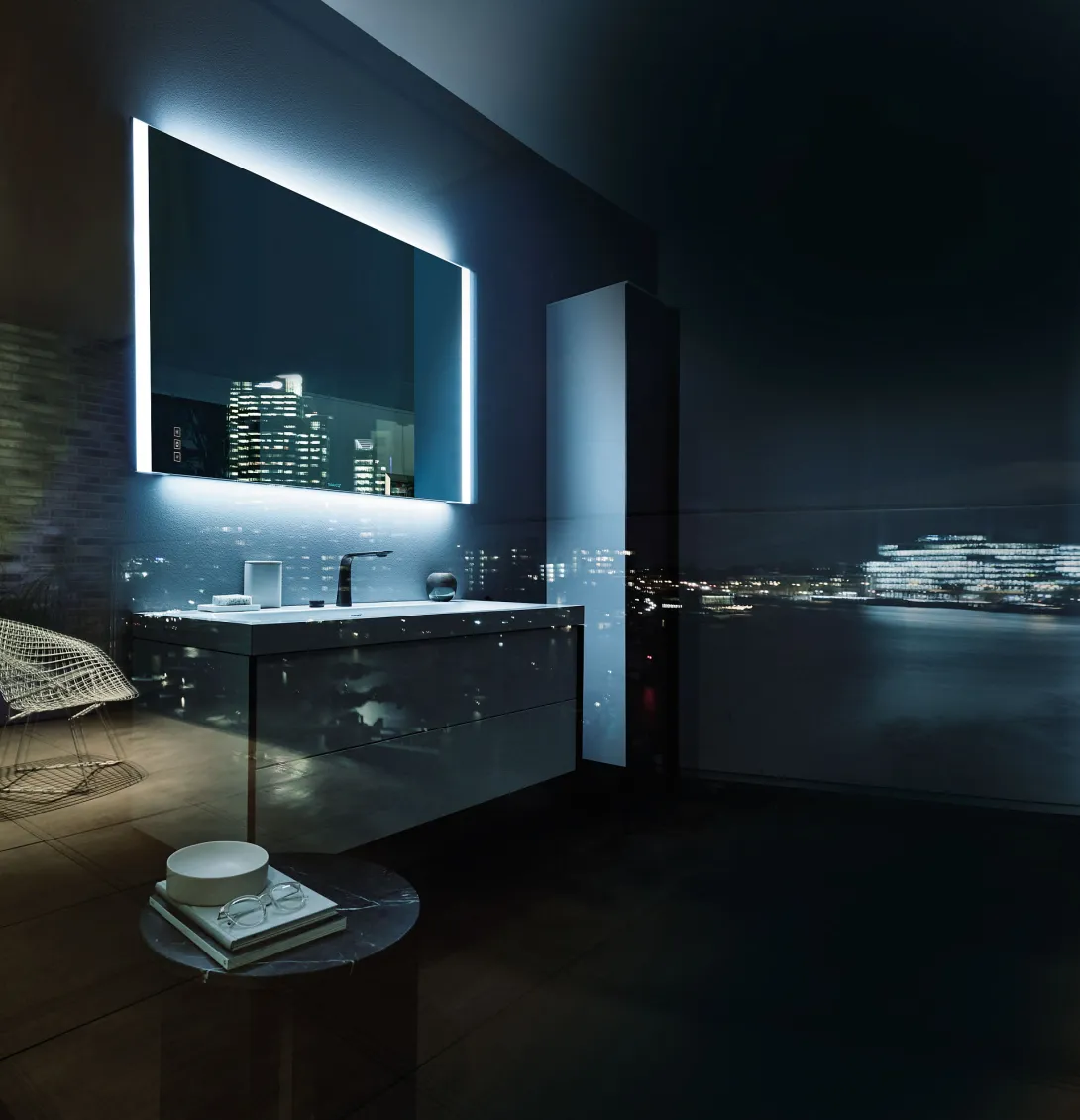 Mit dem XViu-Spiegel können Sie Ihr Badezimmer in ein neues Licht tauchen. Zur Auswahl stehen Ihnen je nach Laune eine dimmbare Ausleuchtung des gesamten Spiegels, Ambientebeleuchtung sowie eine Vielfalt an sonnigem bis nördlichem Licht. Der Spiegel, der mithilfe seiner Icon-Steuerung berührungslos und einfach gesteuert wird, verfügt außerdem über eine Spiegelheizung.