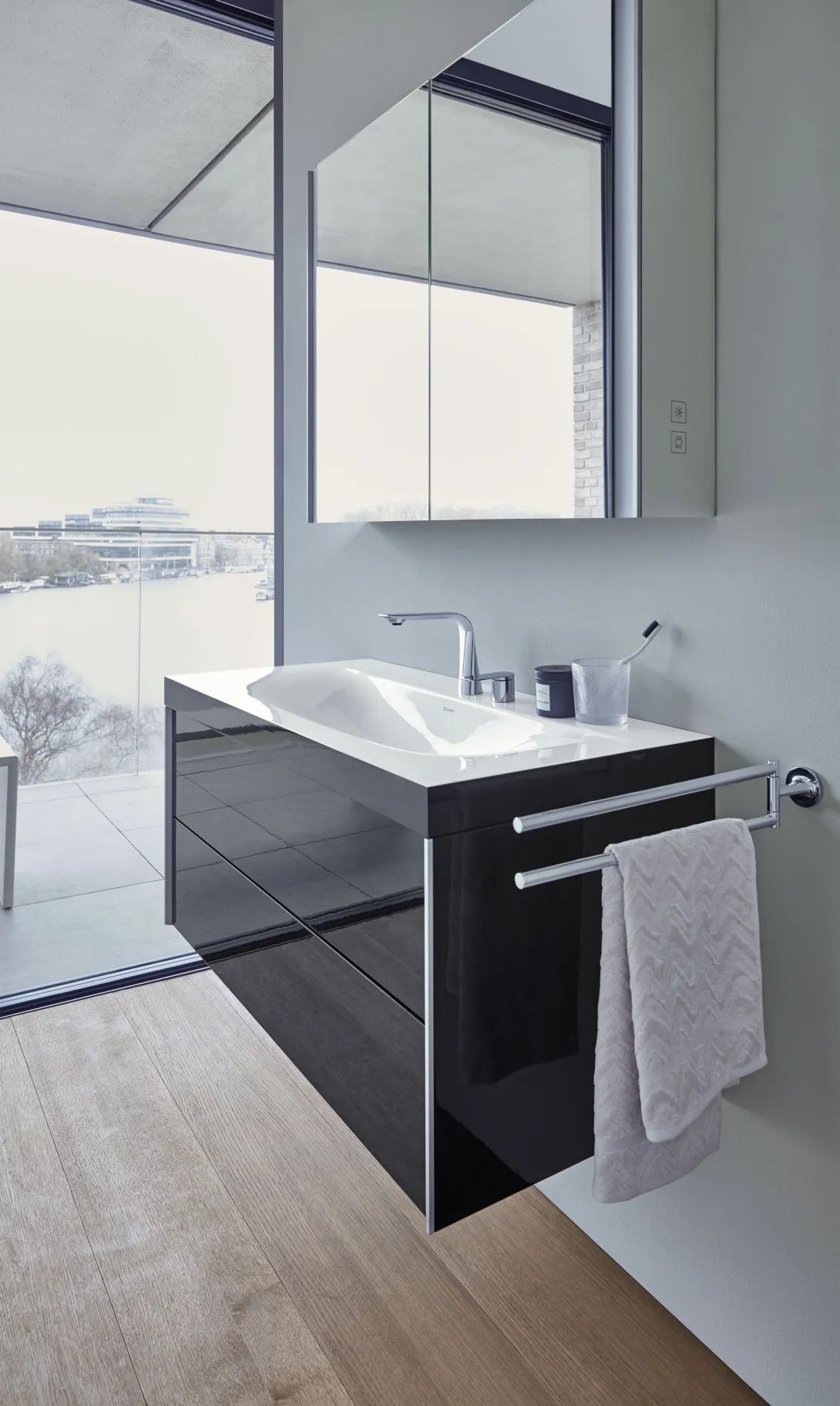 Duravit Waschbecken mit Stahlrahmen in einem modernen, schlicht eingerichteten Bad mit Spiegel und Ablage für Handtücher.