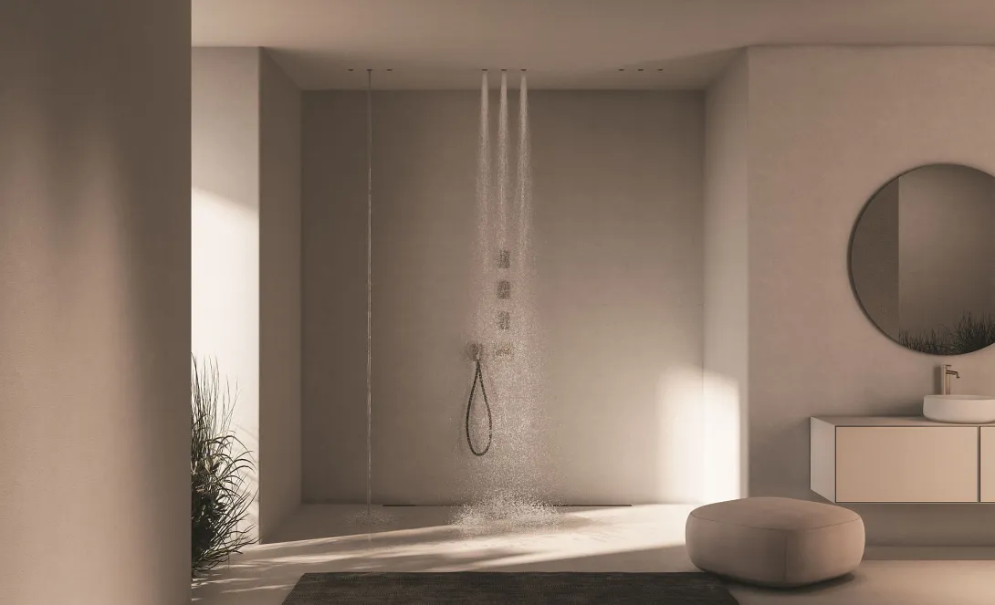 Waterdot eröffnet neue Spielräume für individuelles Duschdesign. Das Duschsystem besteht aus einer Reihe von Duschköpfen mit kleinem Durchmesser, die sich miteinander kombinieren lassen. Vier Strahlarten – Regen, Laminar, Nebel und Mikado – sorgen dabei für ein unvergleichliches Duscherlebnis.