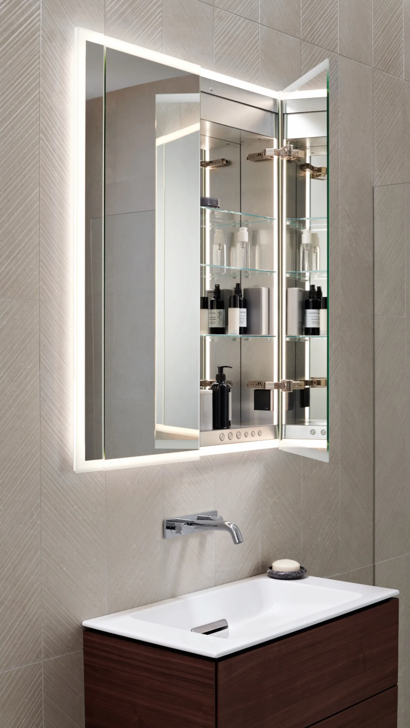 Die ästhetisch überzeugende Integration des Spiegelschranks von Geberit ONE in die Wand verkleinert den Spiegelschrank optisch und lässt das Badezimmer großzügiger erscheinen. Der Spiegelschrank verfügt über einen mattierten Spiegelrand, der Fingerabdrücke unsichtbar macht. Er wird in vier Größen angeboten.