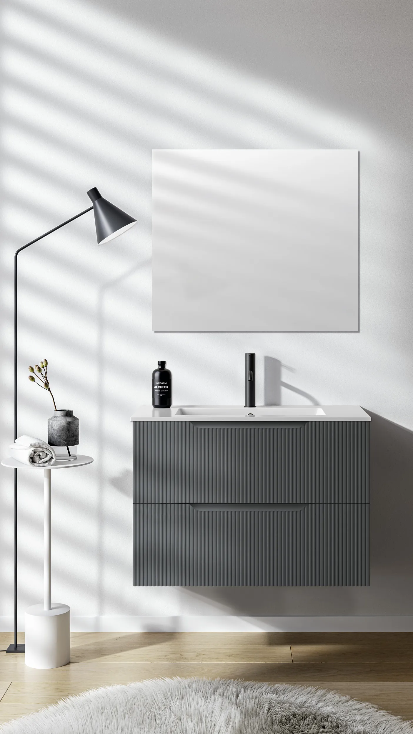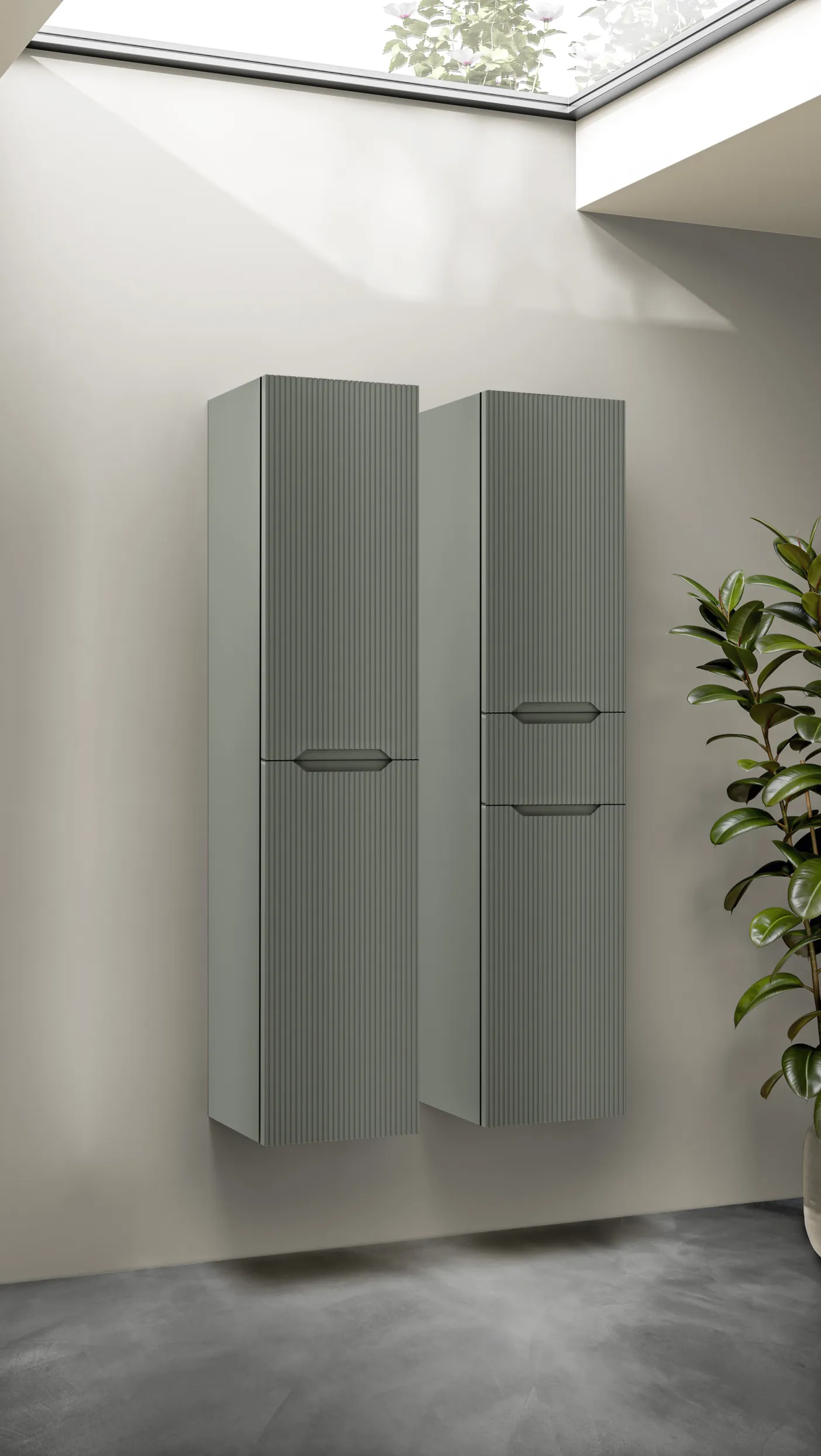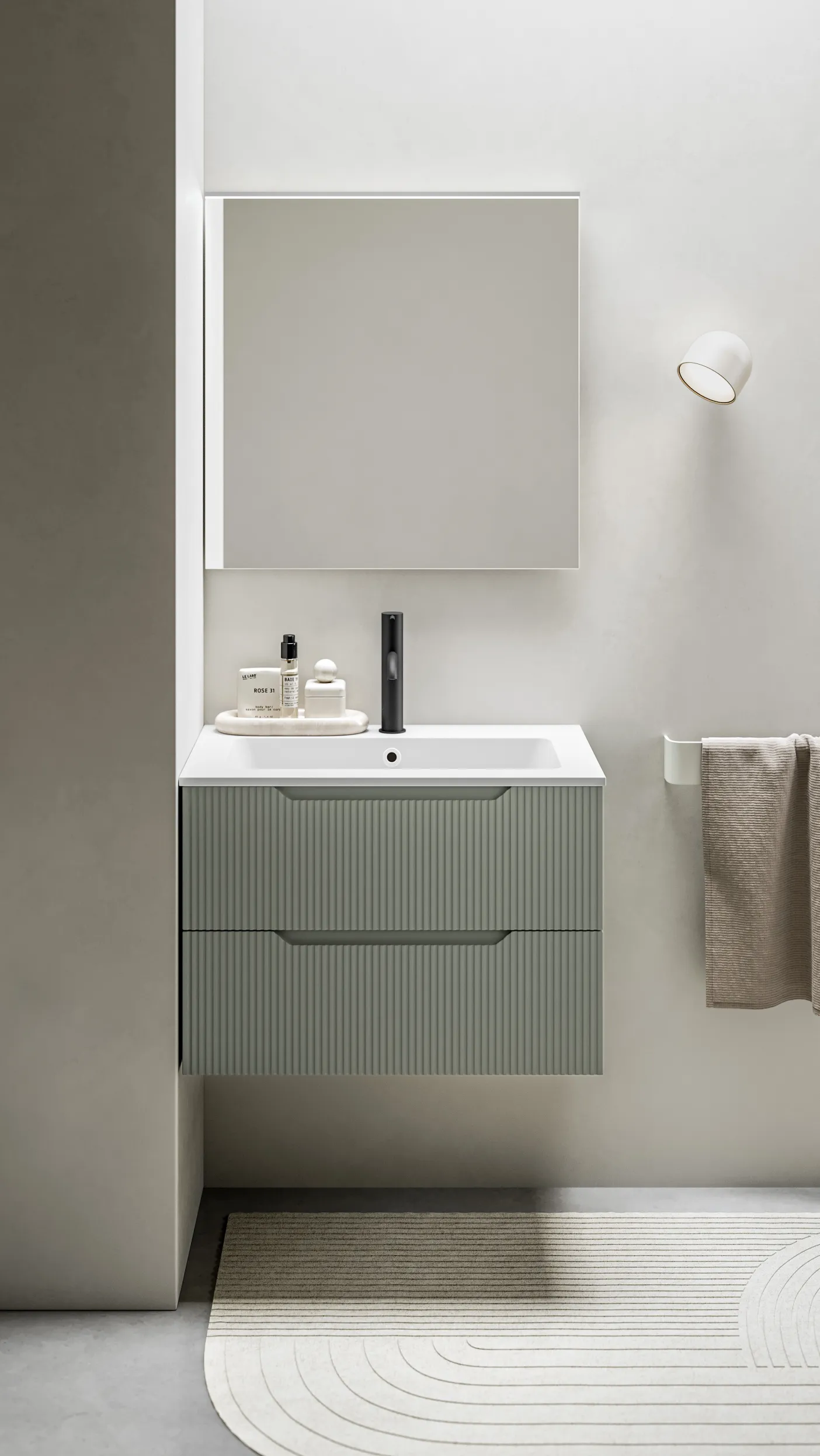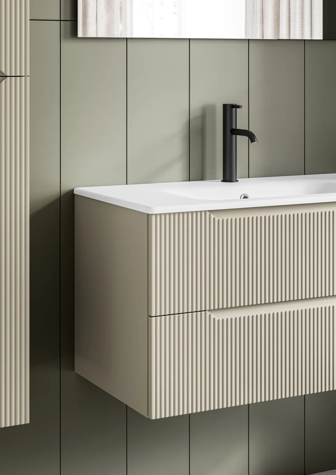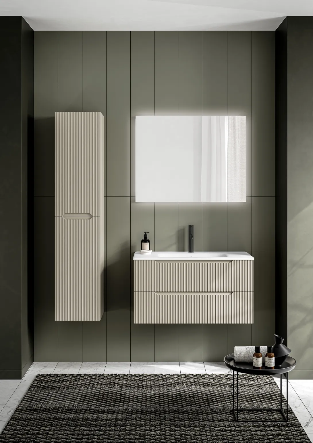 Stocco Badmöbel mit geriffelter Front in Elfenbein und großem Spiegel vor Fliesenwand.
