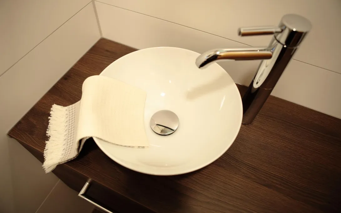 Im Gäste-WC wird das wohnliche Ambiente fortgeführt. Für eine Besonderheit sorgt das kreisrunde Aufsatzbecken.