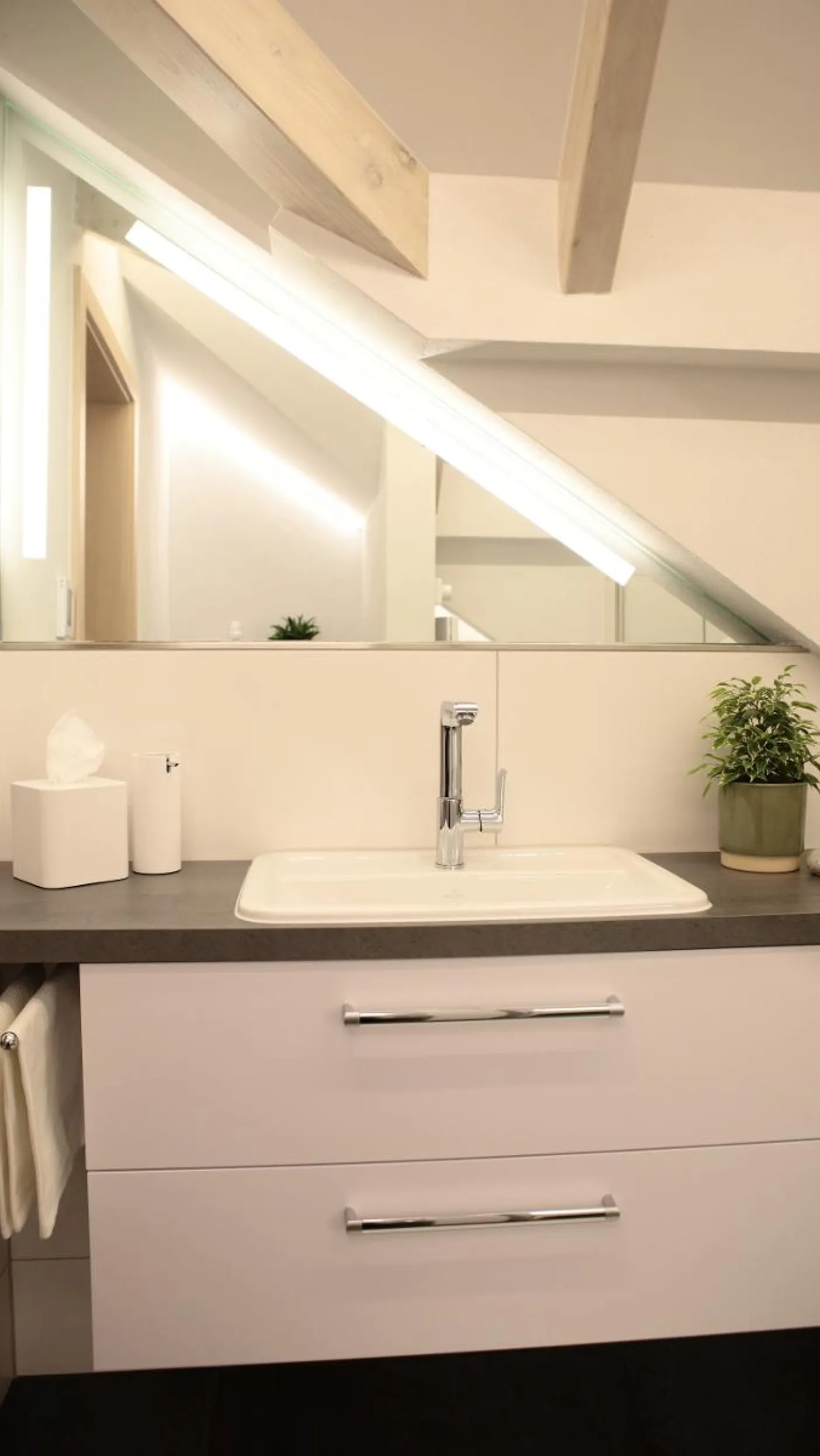 Die Gegebenheiten waren so, dass für einen Spiegelschrank kein Platz war. Daher empfahl Badplanerin Gabi Würschum einen Lichtspiegel in Sonderanfertigung, der über zwei integrierte Leuchten verfügt. Die dreieckige Form setzt auf geschickte Weise die Dreiecksformen unterm Dach fort und vermittelt ein stimmiges Bild.