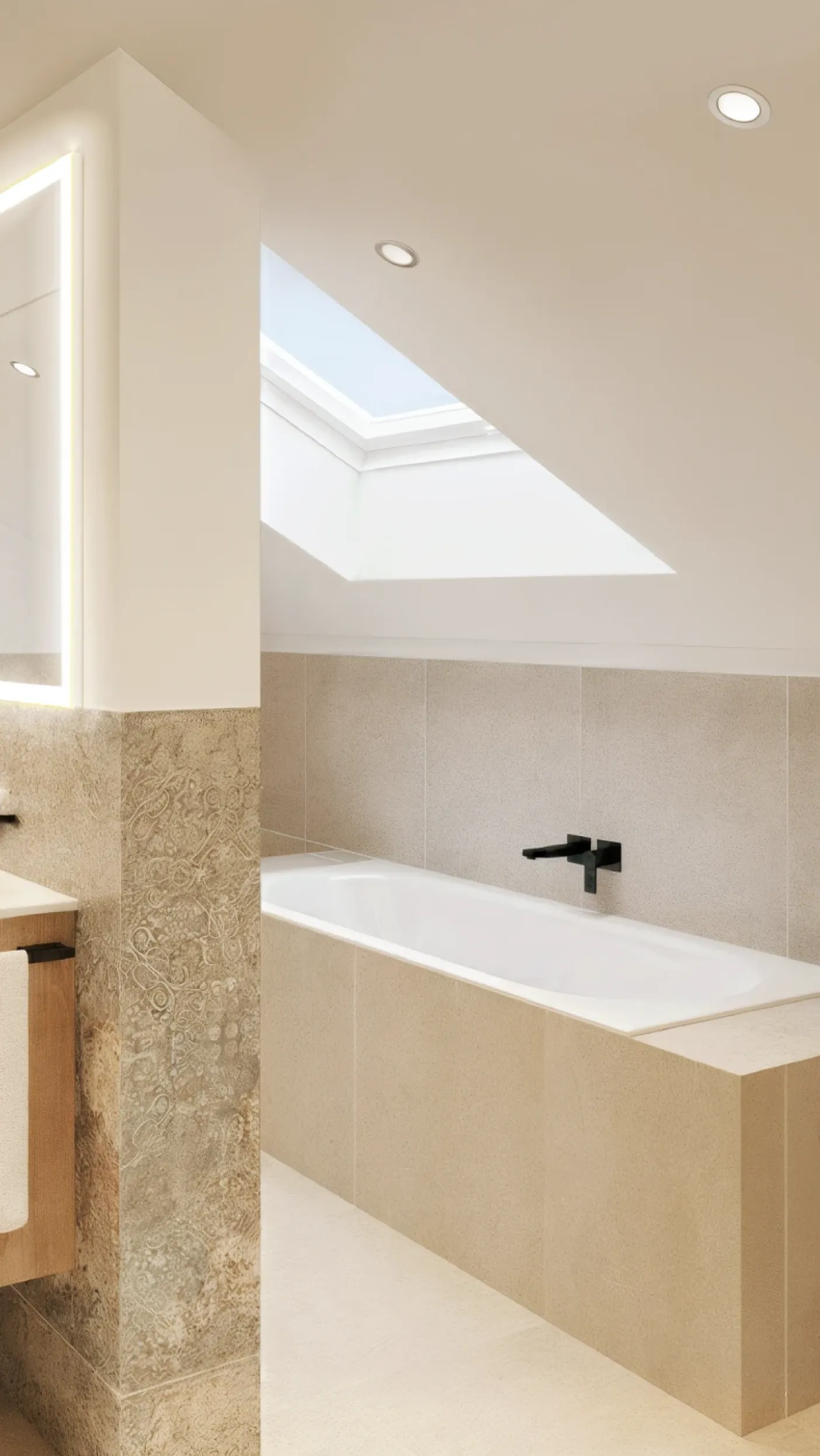 Das funktionale Raumkonzept nutzt jeden Quadratmeter optimal. Die Anordnung von Dusche, Wanne und Waschtisch wurde präzise auf die Dachschräge abgestimmt. Maßgefertigte Möbel und passgenaue Nischenlösungen bieten Stauraum, ohne den Raum optisch zu verkleinern. Dank des harmonischen Zusammenspiels von Beleuchtung, Farbwahl und Materialtextur entstand ein Bad, das durch Ruhe und Klarheit überzeugt.