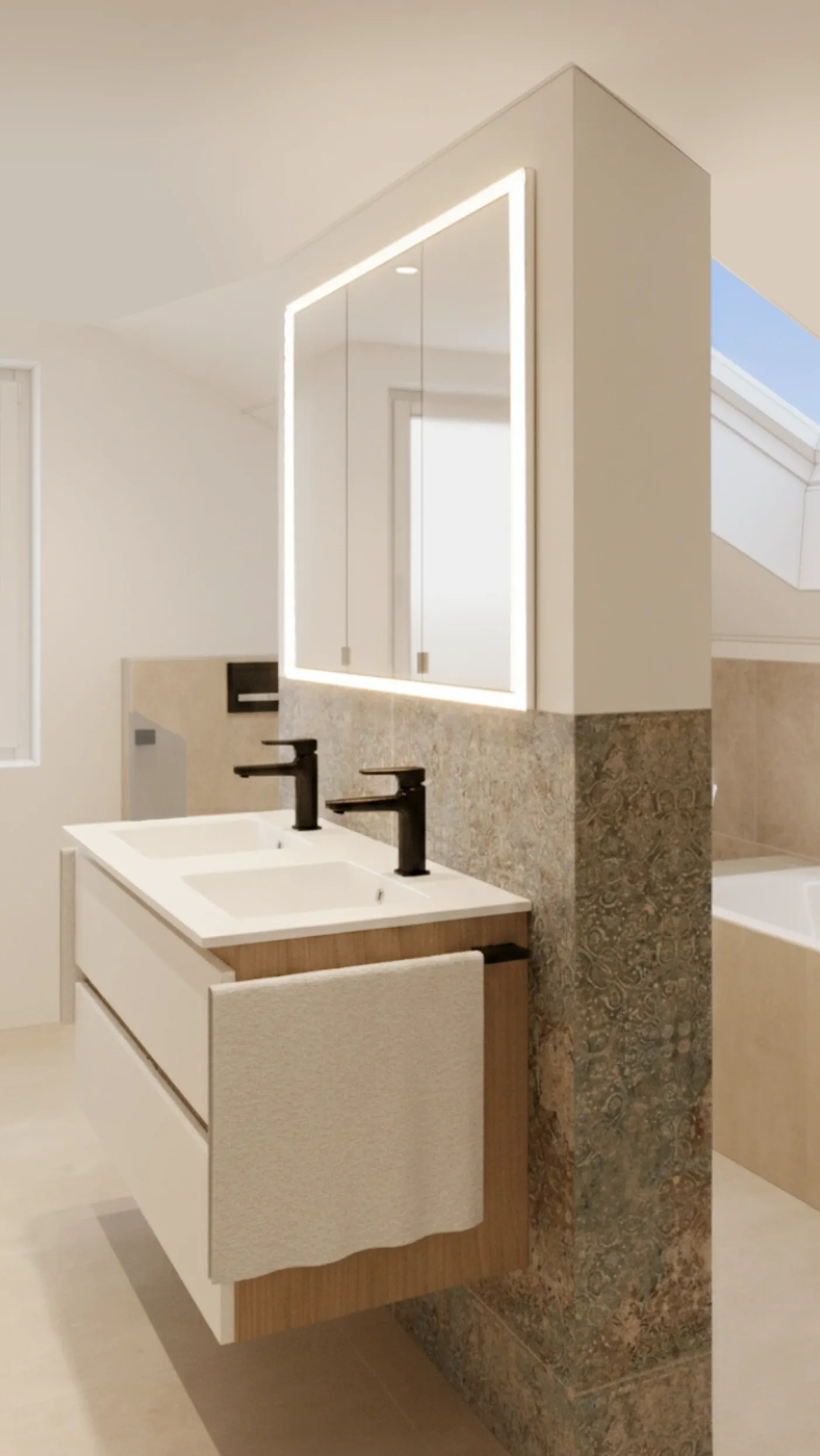 Mit der neuen Badgestaltung entstand ein Raum, der Eleganz und Funktionalität perfekt vereint. Das zeitlose Farbkonzept sorgt für eine natürliche Wärme, während klare Formen und hochwertige Details dem Bad eine moderne Note verleihen.
