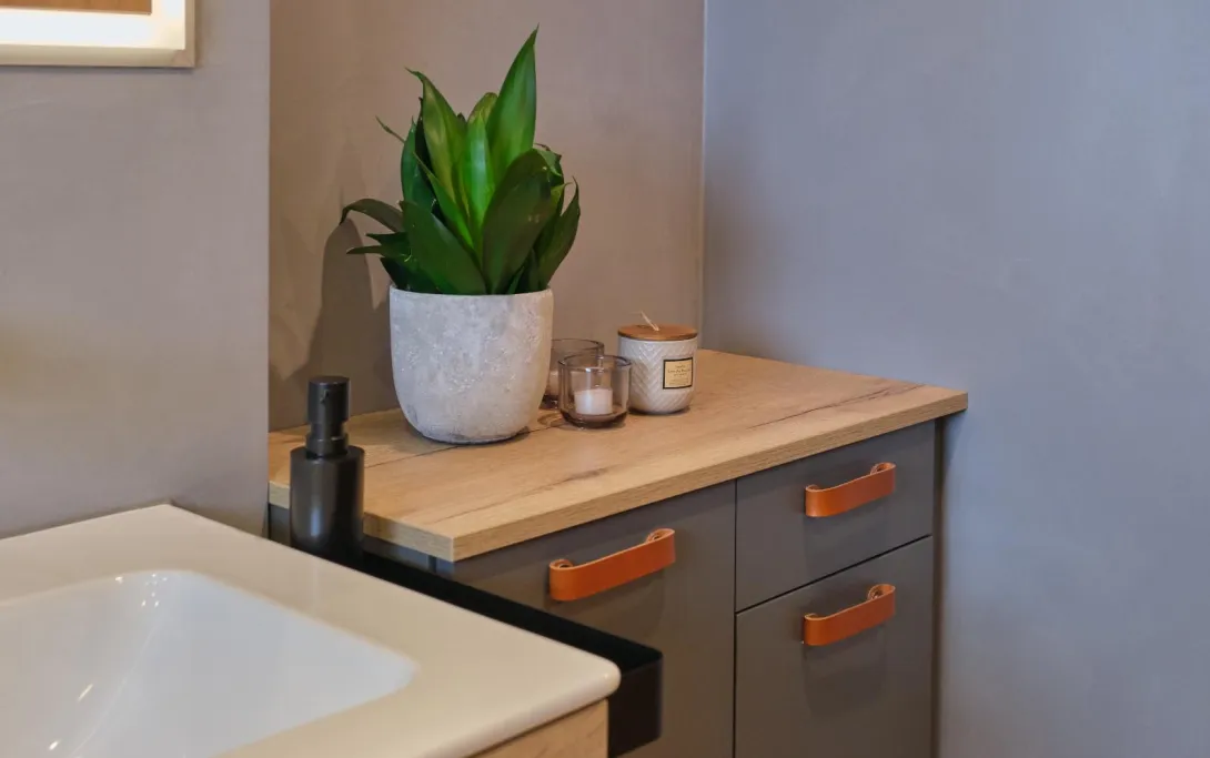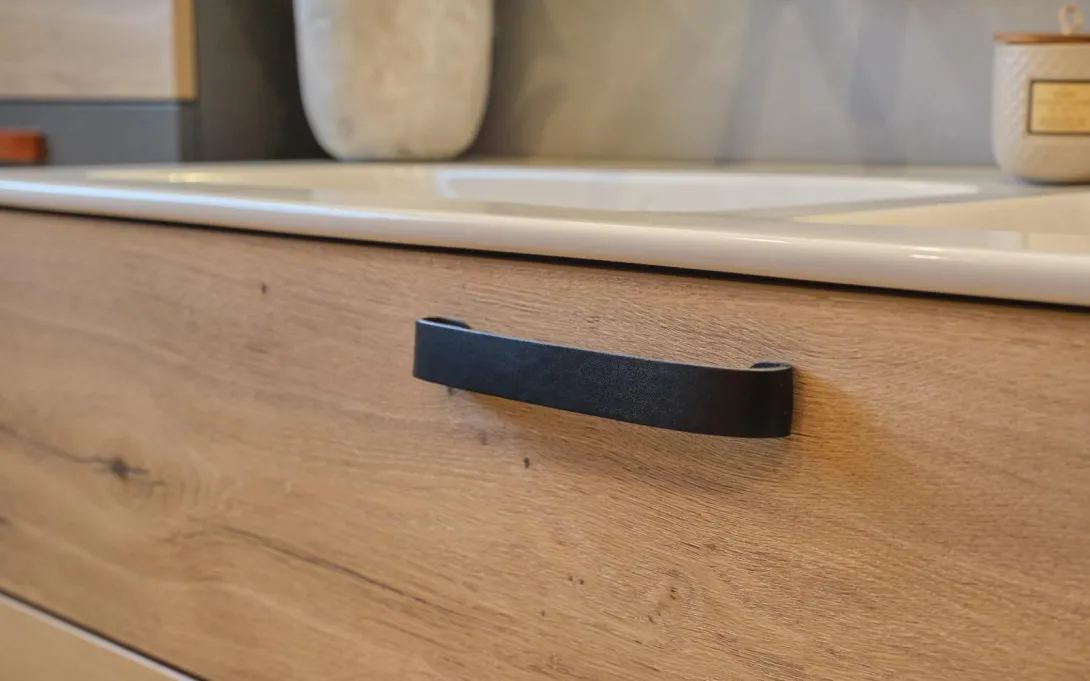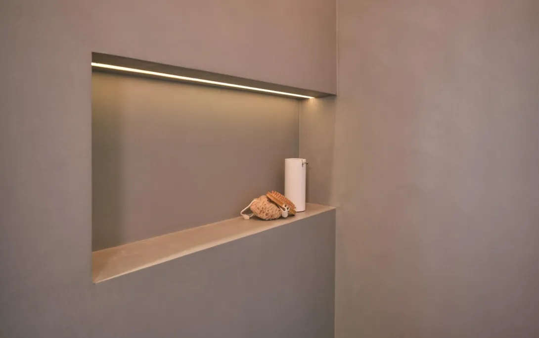 Zentrum des gesamten Waschplatzes ist der Einbau-Spiegelschrank Emco Asis Prime, der sich der gewählten Ausstattung harmonisch anpasst und eine weitere Lichtquelle bildet. Die Nolff-Schränke zu beiden Seiten des Waschtischs bieten genügend Stauraum für eine Familie und sind farblich auf die Wänden und den Boden abgestimmt. Ein originelle Besonderheit sind die ledernen Griffe an den Schubladen und Schranktüren sowie die beleuchtete Nische in der Dusche.