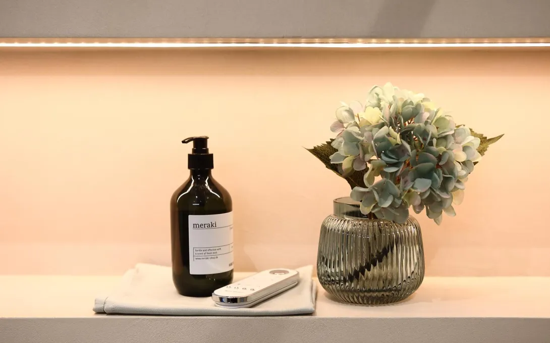 Die einheitliche Farbgebung des Badezimmers mit einladendem Charakter setzt sich in der Dusche fort. Ein schöner Blickfang der Dusche ist dabei die beleuchtete Nische, die sich bis zum WC zieht. Sie spendet nicht nur angenehmes Licht, sondern lässt sich auch als Abstellfläche nutzen. Für eine Möglichkeit zum Sitzen sorgt die gemauerte und verspachtelte Bank am Ende der Dusche.