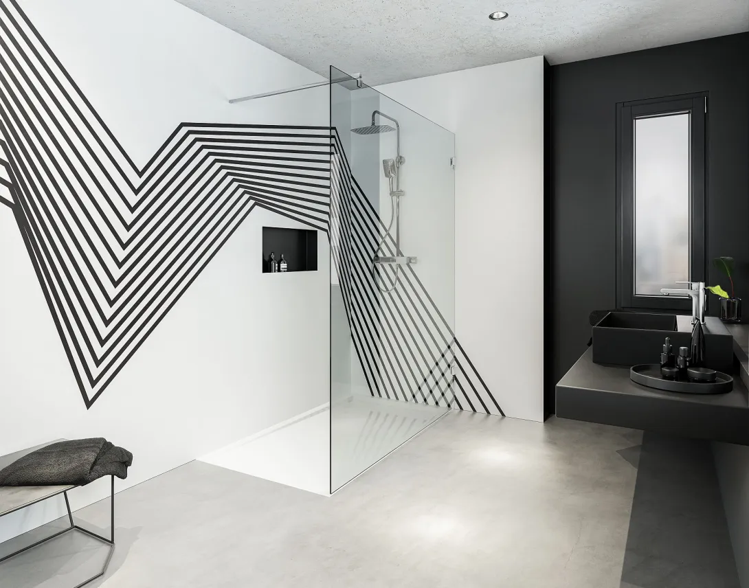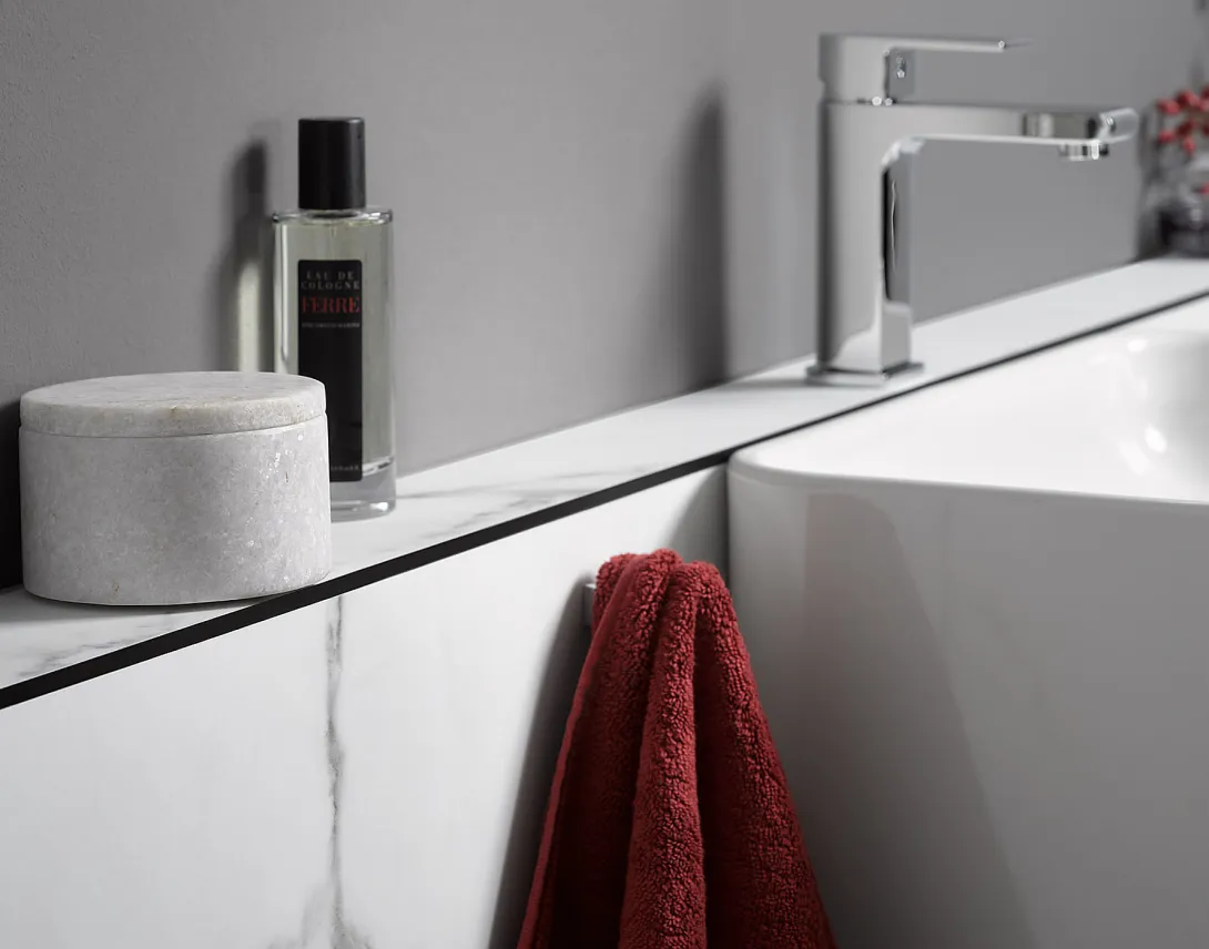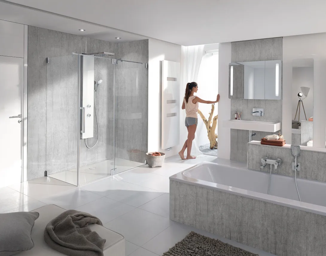 Die großformatigen Platten von RenoDeco sind vielseitig einsetzbar und erzeugen ein einheitliches und modernes Badezimmer-Ambiente. Dabei sind sie auch äußerst praktisch: So lassen sich z.B. unvollständige Wände abdecken, um sie zu verschönern und zeitgleich vor Spritz- und Kondenswasser zu schützen.