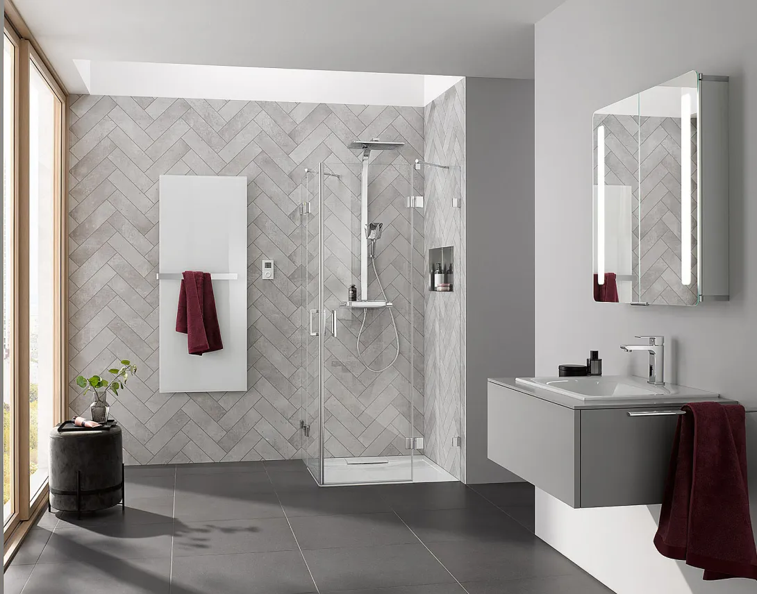 Badezimmer mit Eck-Dusche Aperto und Wandverkleidung RenoDeco von HSK.