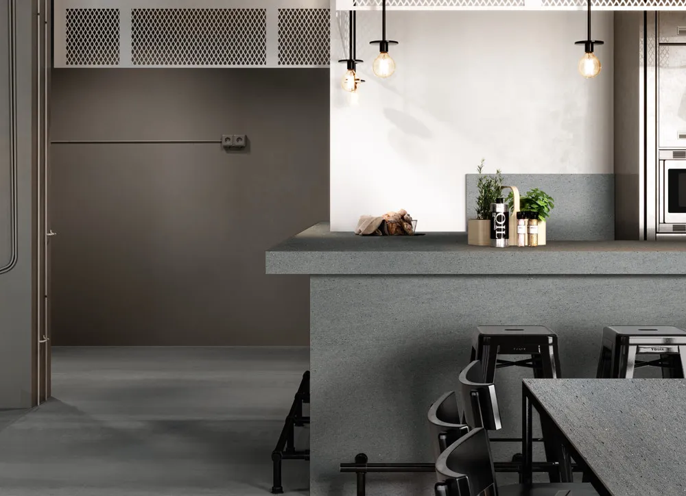 Bistro-Esszimmer mit großformatigen Fliesen in Metalloptik.